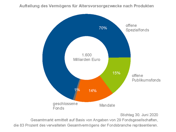 Von dem Vermögen entfallen 1.110 Milliarden Euro auf offene Spezialfonds, 240 Milliarden Euro auf offene Publikumsfonds, 230 Milliarden Euro auf Mandate und 10 Milliarden Euro auf geschlossene Fonds. Hinter dem für die Altersvorsorge verwalteten Vermögen stehen insbesondere kapitalbildende Versicherungen mit 600 Milliarden Euro und die betriebliche Altersvorsorge mit 450 Milliarden Euro. Weitere 340 Milliarden Euro stammen von berufsständischen Versorgungswerken. Die übrigen 200 Milliarden Euro verteilen sich auf die Zusatzversorgung des öffentlichen Dienstes sowie geförderte und ungeförderte Fondssparpläne.